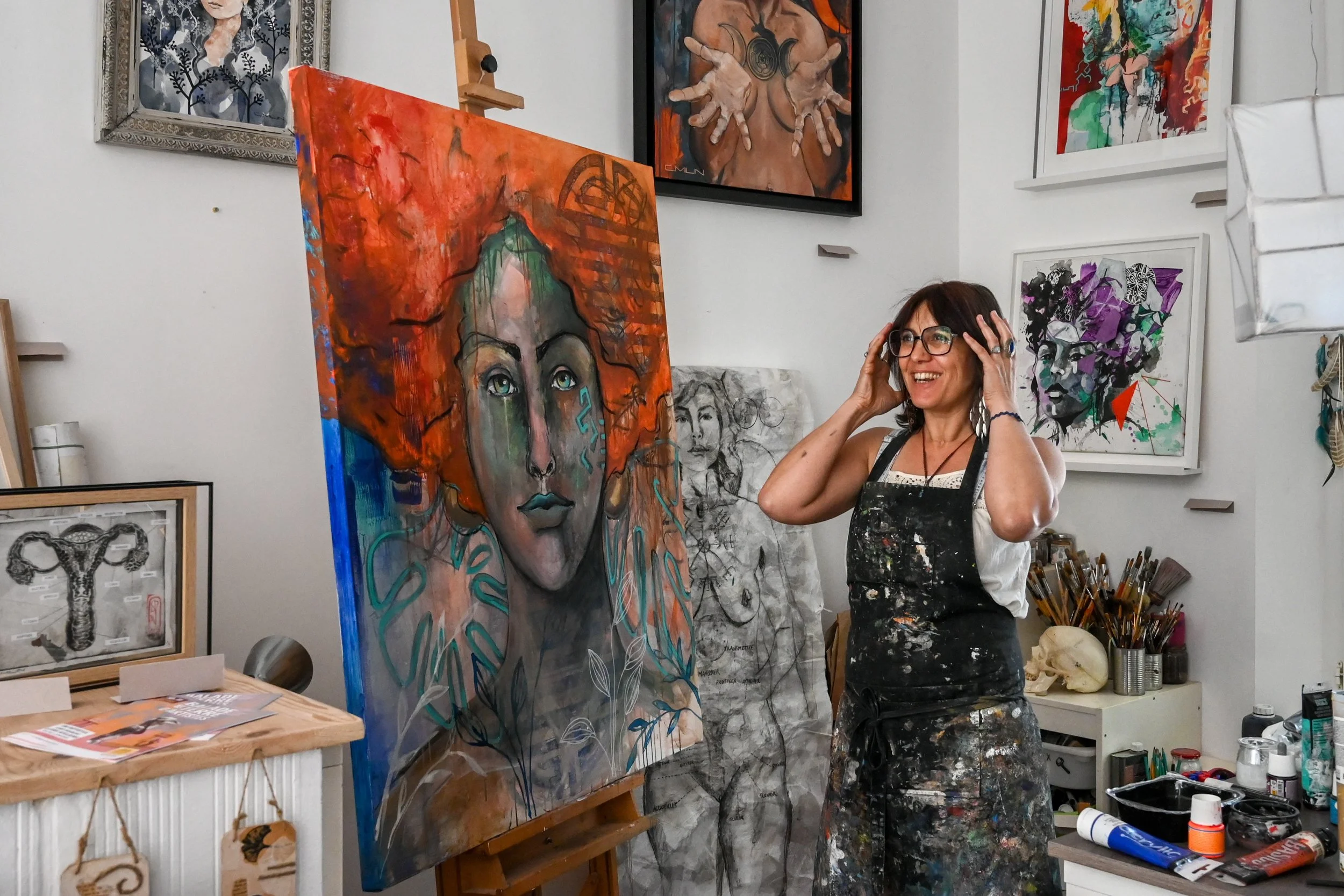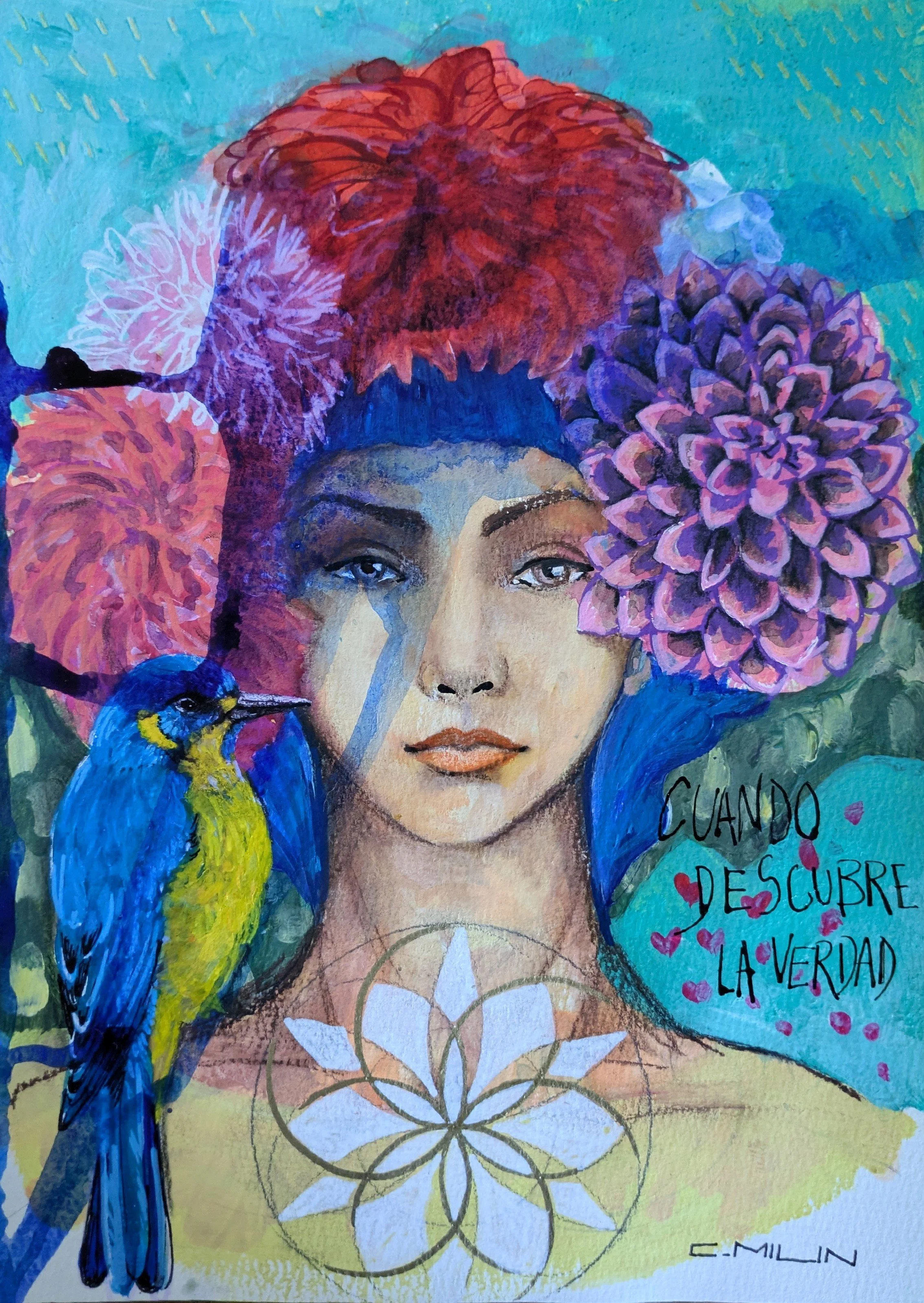 “Je peins des portraits de Gardiennes afin de remettre à sa juste place l’énergie du féminin dans notre société en prenant soin du cœur des femmes grâce aux couleurs vives, aux regards puissants et aux symboles forts de mes tableaux.”